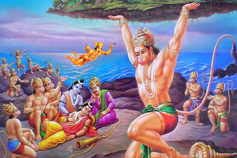 जब लक्ष्मण बेहोश होकर मृत्यु के समीप होते हैं, और उनके जीवन को बचाने के लिए हनुमान जी हिमालय की ओर उड़ान भरते हैं।