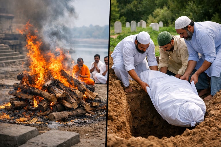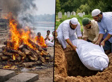 हिंदू धर्म में दाह संस्कार और मुस्लिम-ईसाई परंपरा में दफनाने की प्रथा क्यों है? क्या यह सिर्फ धार्मिक नियम है या इसके पीछे गहरी आध्यात्मिक, ऐतिहासिक और वैज्ञानिक सोच छिपी है? इस विस्तृत लेख में जानिए तीनों परंपराओं की मूल मान्यताएँ, दर्शन और वास्तविक कारण।